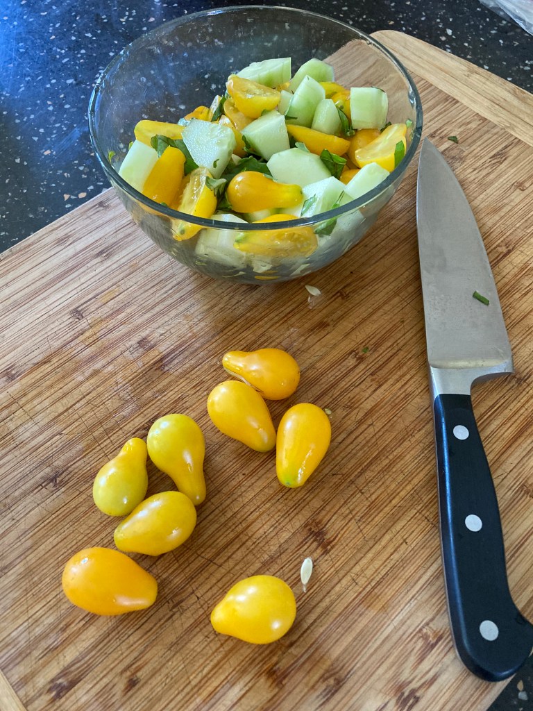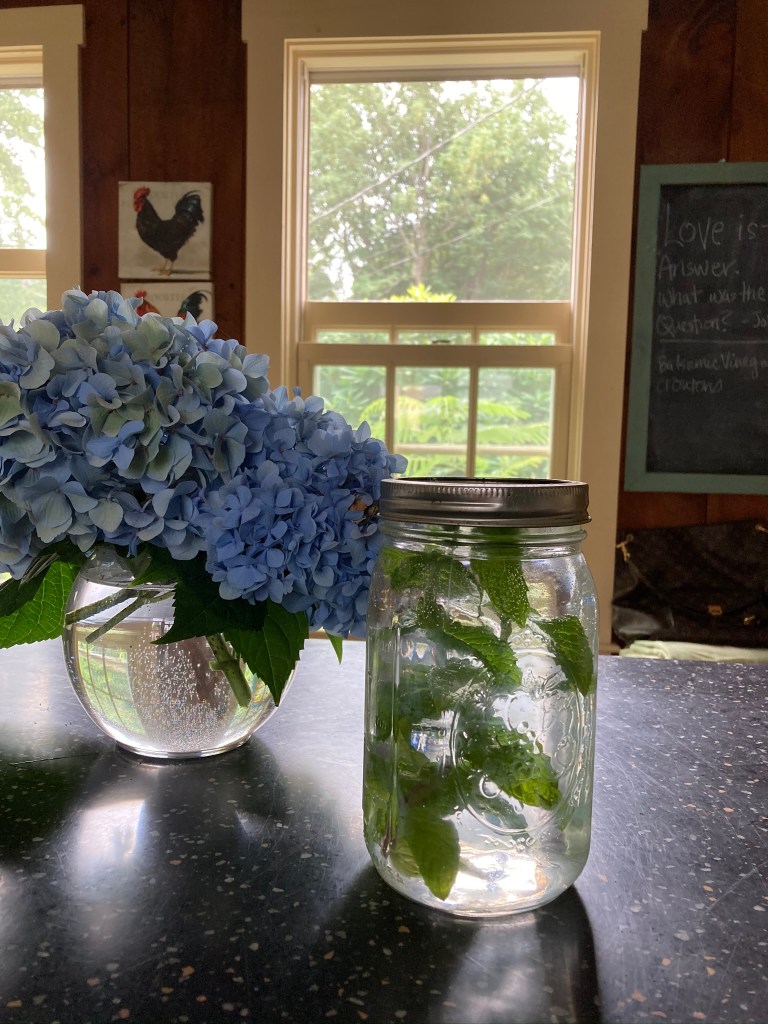 Today was hot and sunny in Holliston. A workday for me, but I had a chance to grab a few things from the garden and grounds. The yellow pear tomatoes and cucumber for lunch, the bush beans for dinner, and some hydrangeas for the counter and peppermint for water.