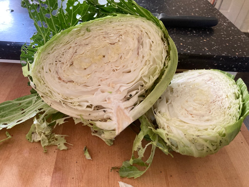 Back to the cabbage: the rabbit doesn’t seem to have eaten much. It looks like there were some caterpillars having their way with it – I’d noticed them chewing holes in the outer leaves over the weeks the plants grew but I decided to keep taking care of the plants and watch what happens. So I picked the cabbage yesterday: