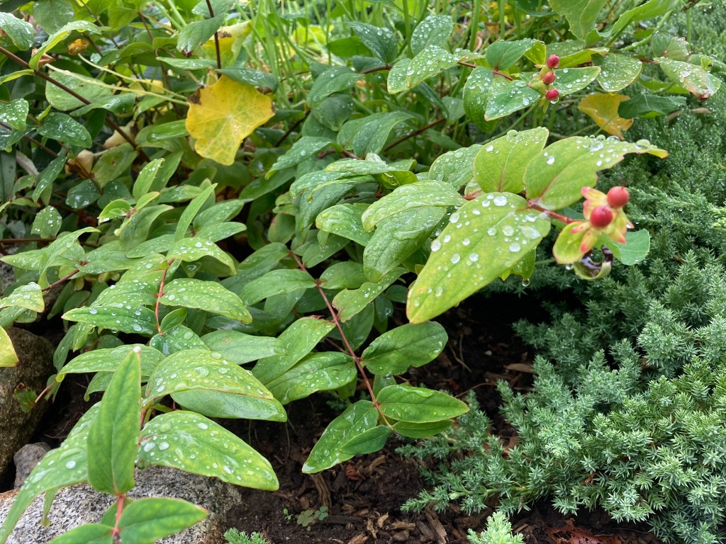 The spot I had in mind next to the kitchen has a slope. It used to be a barn, actually, which is a bit mysterious to me since I would expect the spot the barn stood on to be flat. The barn, now gone, was blown over by a hurricane in 1933. Since the barn’s demise, the spot acquired grass to become a grassy hill next to the house with a few well-established foundation plantings.