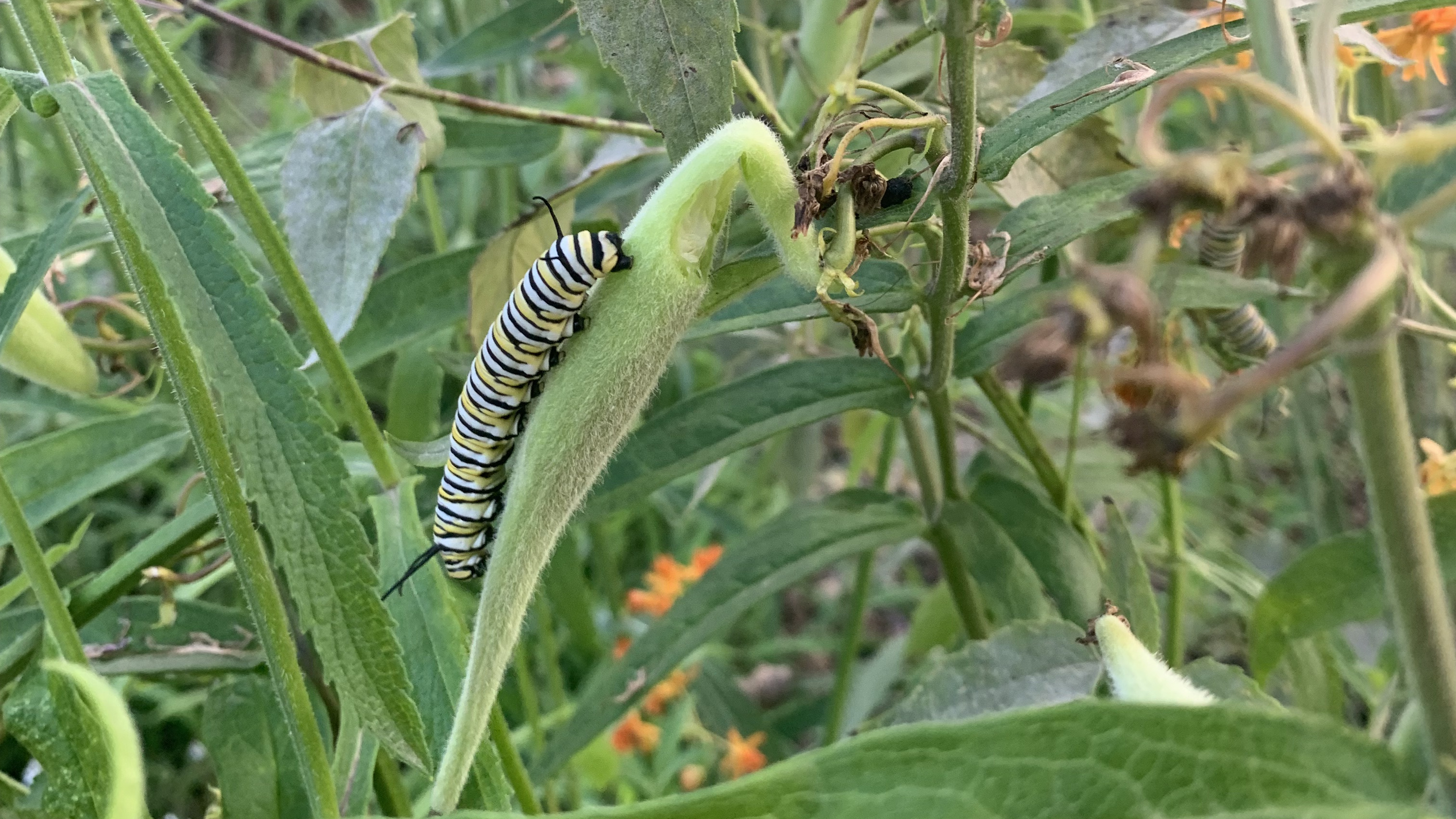 Monarch Caterpillar on Asclepius pod in our herb garden